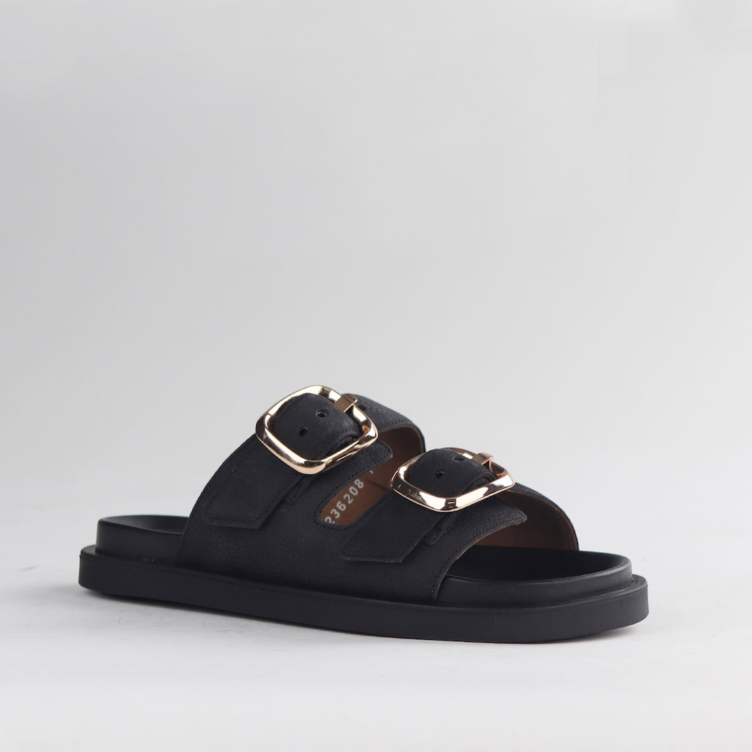 You have not felt comfort like this before with our Birk-en-not Double Buckle Slide! Featuring chunky rubber soles and moulded footbeds with arch support, these slides are designed for all day comfort. Style them all year round with jeans or summer dresses for a modern look. Our sleek black Cloud walker footbed technology ensures a soft, cushioned ride, while the chunky soles add a trendy edge. Wear them all year round and stay comfortable in style!