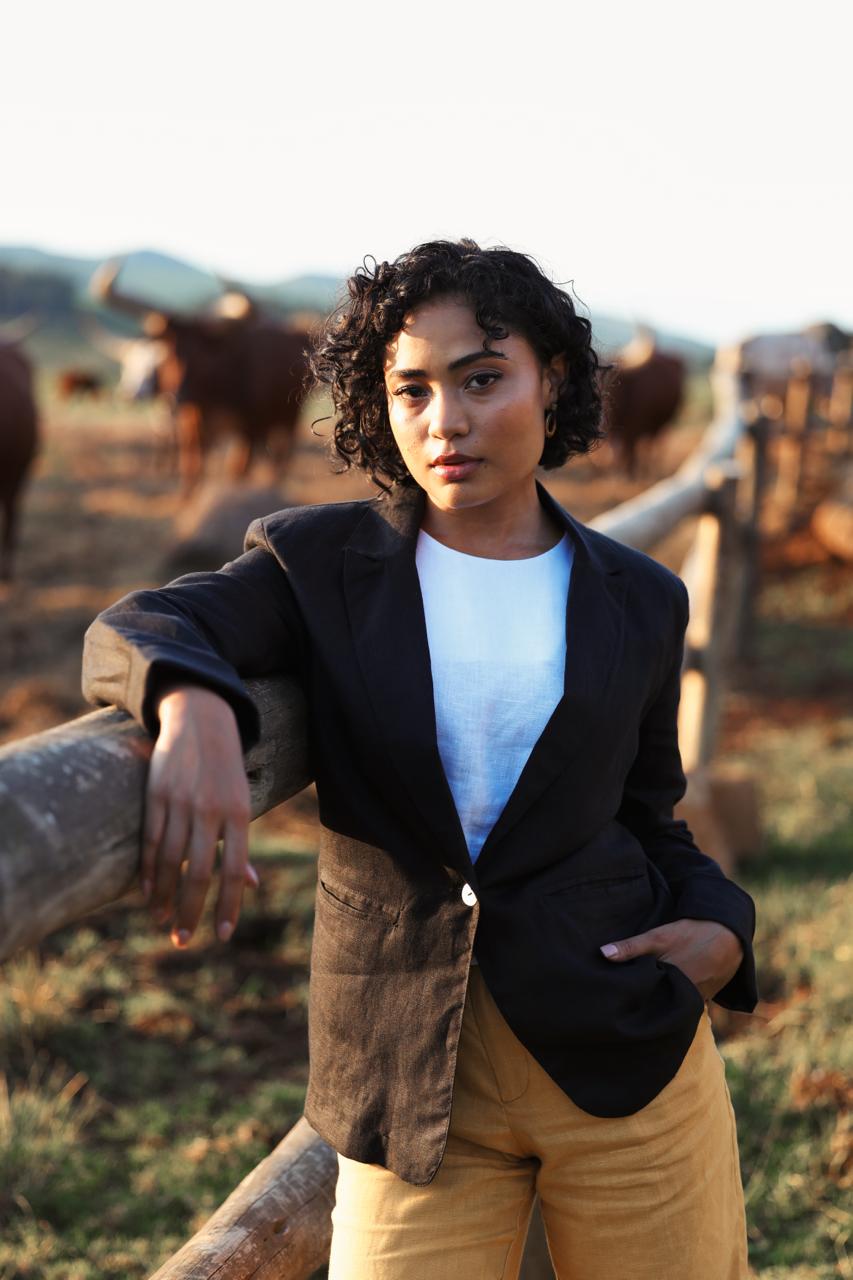 For a more formal look, wear it in matching colours with our Paloma Linen Pants for a classic pantsuit look, perfect for the professional work environment. For a more relaxed ensemble, match it with our Keri Linen Jogger Pants for an evening out or travel. For a bold statement, pair it with our Dani Shorts in matching colours, ideal for the modern business environment.